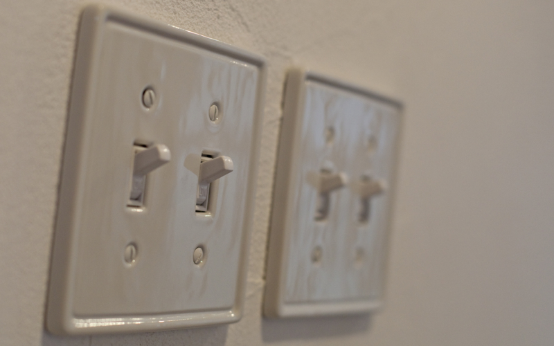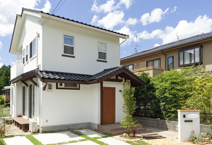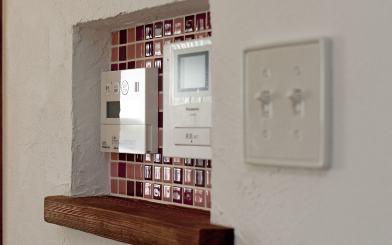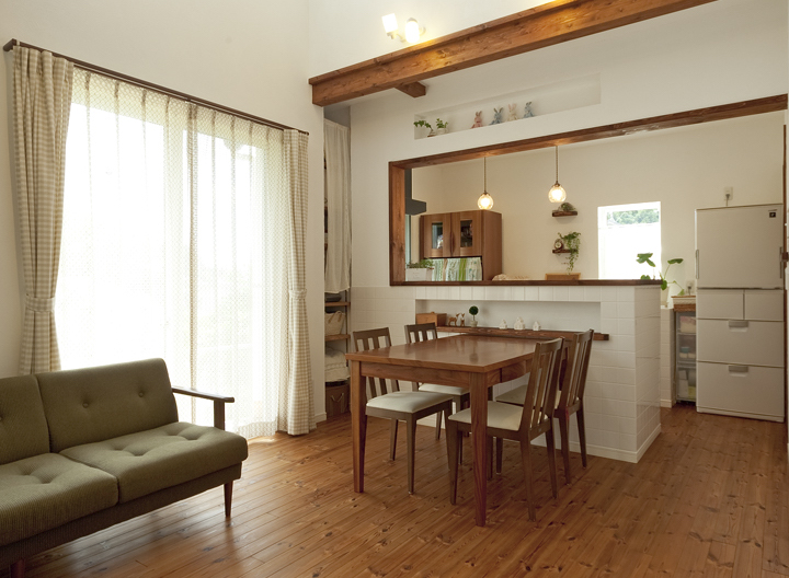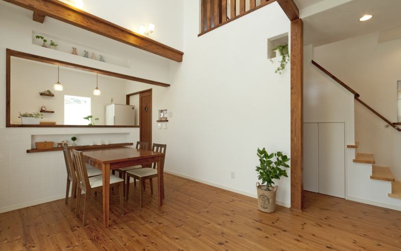 スイスウォールの内外装に、無垢材にはリボス自然健康塗料。漆喰と木の心地よい空間に飾り棚や照明、スイッチプレートにいたるまでセンスがあふれています。