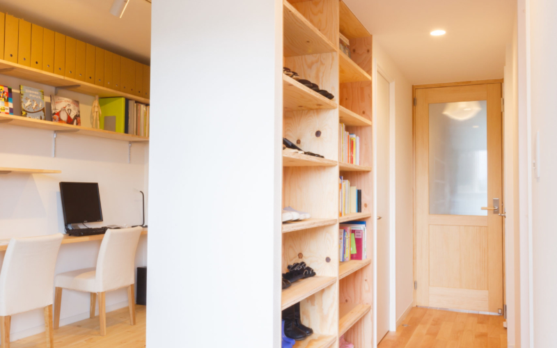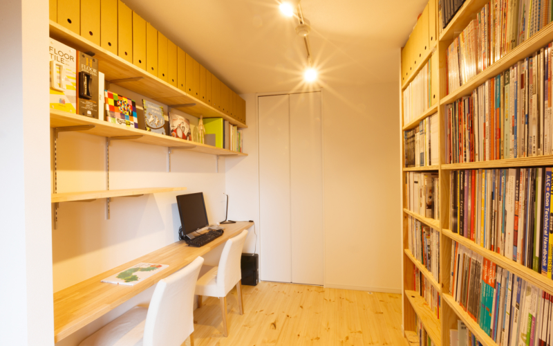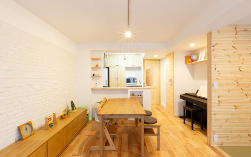 マンションのリノベーションにカルククリームを採用。無垢材の床や、二重サッシで防音と断熱を兼ね備えたピアノスペースなどを確保し家族の生活に合せたリノベーション例。
